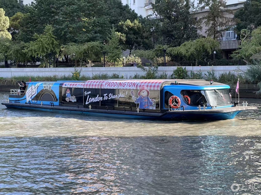 本次悠游苏州河水上航线将其璀璨星河系列游船“昌平号”打造成为“帕丁顿主题游船”,船身以巨型帕丁顿熊造型为主视觉,还原其坐在复古行李箱上、手捧礼物的经典形象,搭配“From London To Shanghai!”标语,复刻了电影中的温暖场景。“昌平号”游船主色调也与“帕丁顿熊”基本一致,全船打造延续英伦风格,从配色到细节装饰,营造出浓厚的伦敦氛围,将成为市民游客拍照打卡的“移动影棚”。